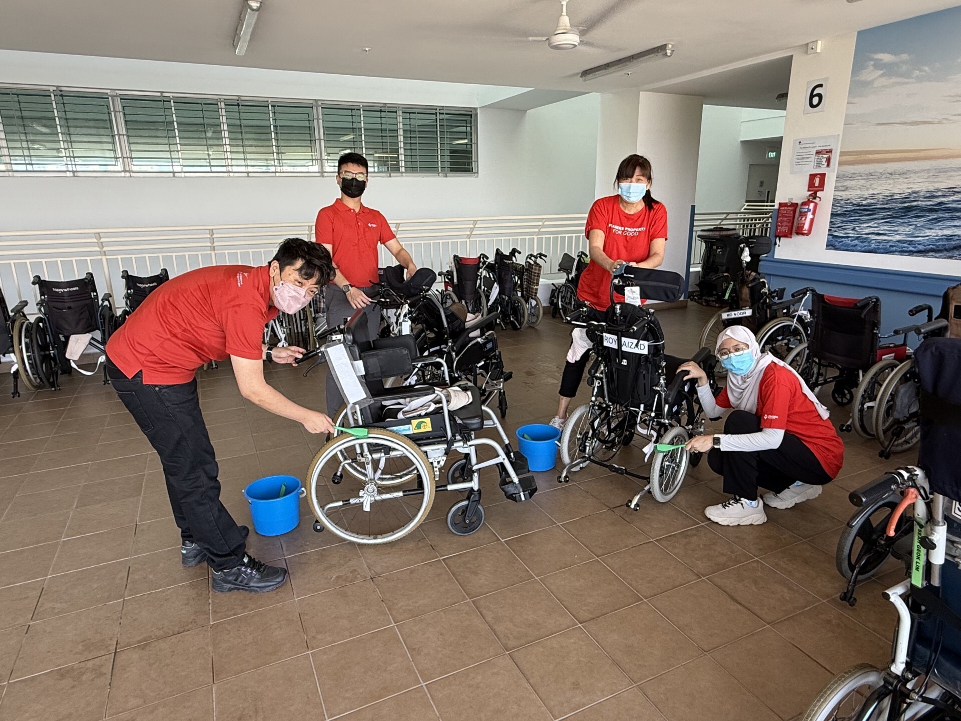 Frasers Property employee volunteers continue to give their support for a variety of causes championed by the Singapore Red Cross, including cleaning of wheelchairs and equipment, befriending residents at Red Cross Home for the Disabled and sorting of donations at the Red Cross shops.